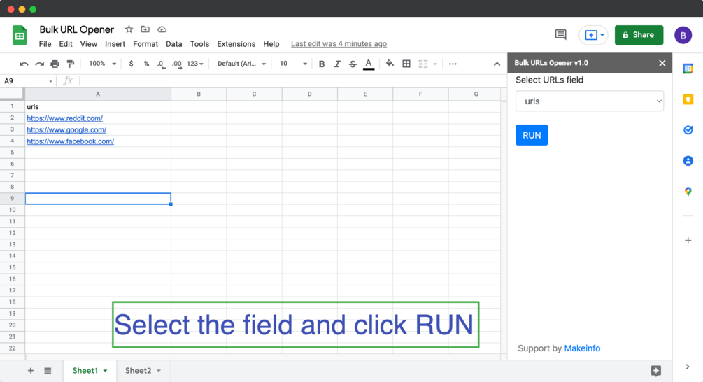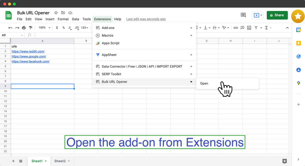 Bulk URLs Opener is a Google Sheet template that can open multiple links as new tabs from your Google Sheet.